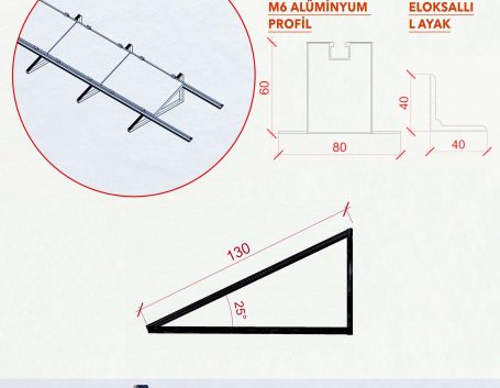 Kit İçeriği: MM6 Alüminyum Profil, Eloksallı Açılı Ayaklar (4 adet), Panel Tutucular Set, M8 Imbus Cıvatalar, Ejot Muadili Sivri Vidalar , Profil Birleştirme Aparatları, Dübeller
